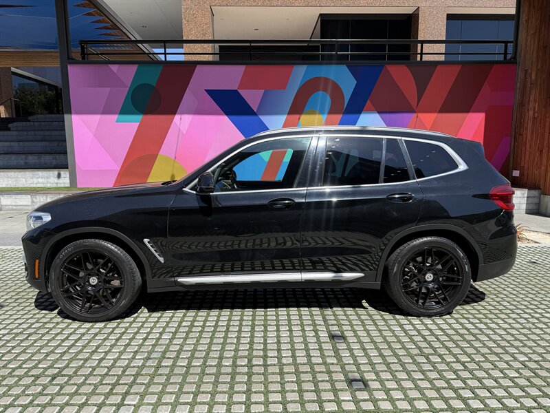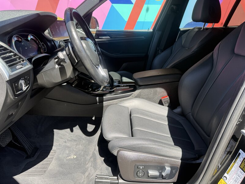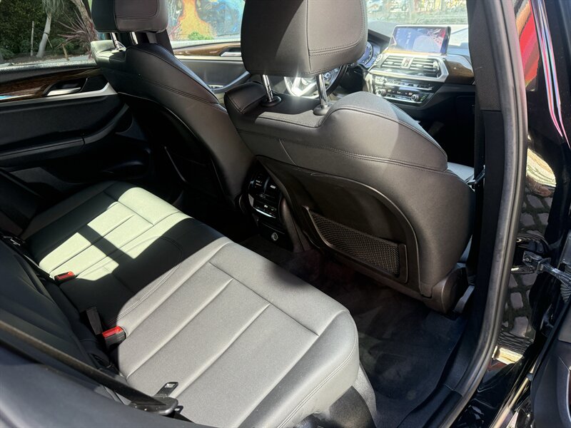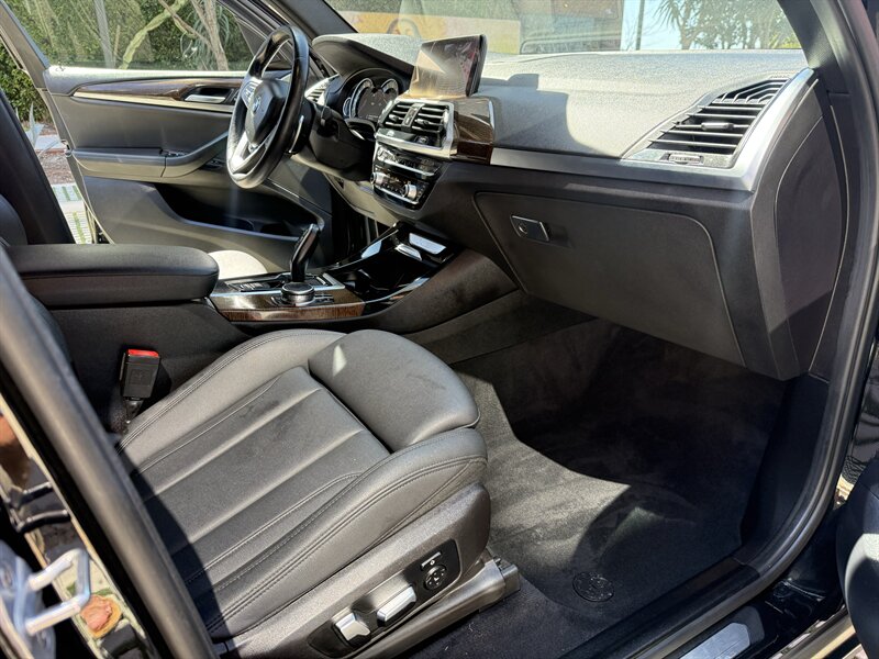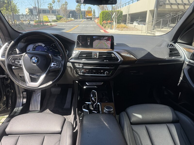 Factory equipment and features (stock specification): - Powertrain and driving dynamics: 2.0L turbo I4, 8-speed Steptronic automatic transmission with Sport and manual shift modes, sDrive rear-wheel drive layout, selectable driving modes (including Comfort, Eco Pro and Sport) to modify throttle response and transmission behavior. Multi-link suspension and stability/traction control systems are fitted for a balance of ride comfort and handling precision. - Exterior: Black Sapphire Metallic paint, sculpted body lines, aerodynamic mirrors and roof rails for additional cargo options. Full LED exterior lighting is standard on this generation, including LED headlamps and LED taillights, automatic headlamp activation and integrated daytime running lights. - Wheels and tires: Alloy wheels with all-season tires (factory wheel size varies by trim/options). Tire pressure monitoring system is standard. - Interior and comfort: Black interior with contrast stitching; front seats are power adjustable with supportive bolstering and a folding rear seatback for expanded cargo flexibility. Dual-zone automatic climate control provides independent temperature settings for driver and front passenger. Interior materials and trim are finished to BMW’s premium standards, with attention to fit and finish. - Infotainment and connectivity: BMW iDrive infotainment system with central display and rotary controller, Bluetooth hands-free and audio streaming, USB connectivity and integrated vehicle information. Satellite radio and smartphone integration options were available from the factory. - Convenience: Keyless entry and push-button start, power liftgate, ample storage compartments and split-folding rear seats for practical cargo management. Rain-sensing wipers and power-adjustable heated side mirrors (feature availability may vary by original build specification). - Safety and driver aids: Comprehensive passive safety with front, side and curtain airbags, anti-lock braking system (ABS), and dynamic stability control. A rearview camera is standard; optional driver assistance packages on the 2019 X3 could add features such as adaptive cruise control, lane departure warning and forward collision mitigation depending on the original factory configuration.
